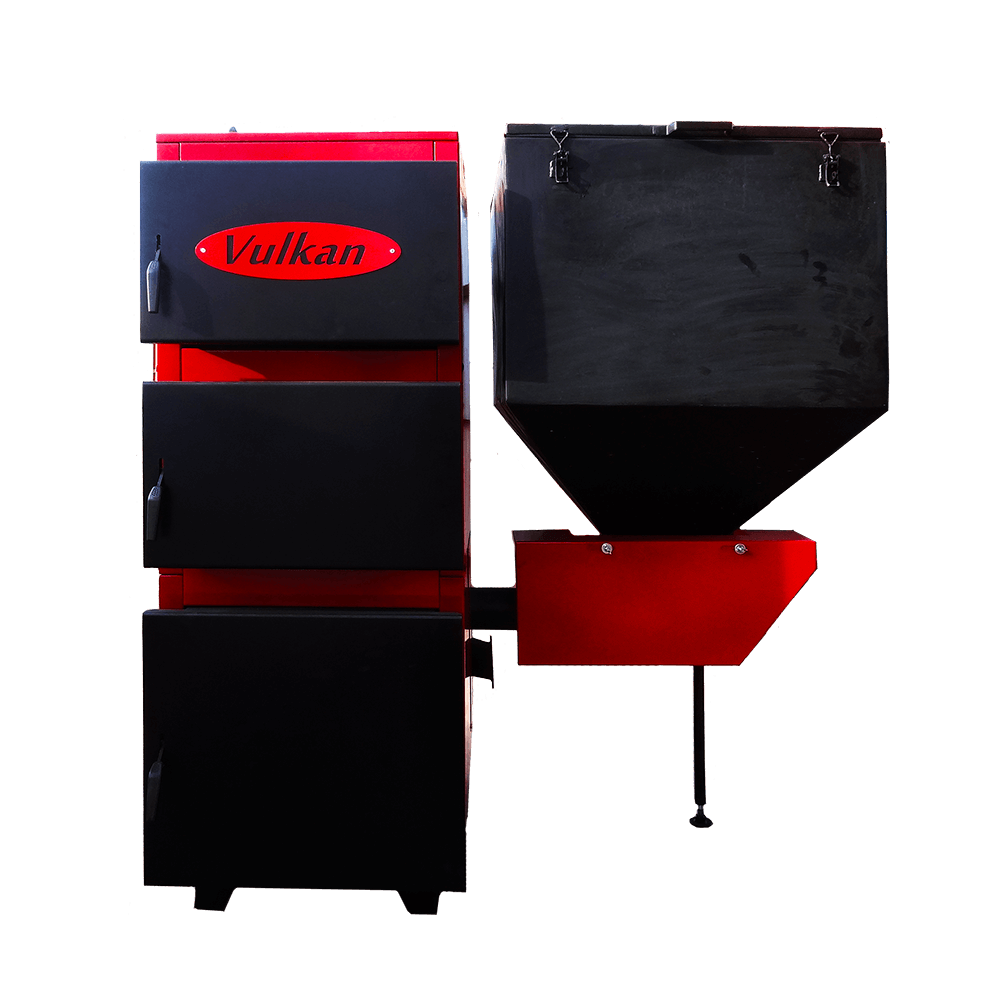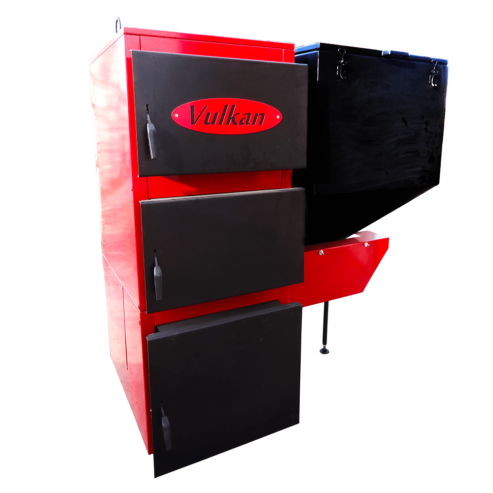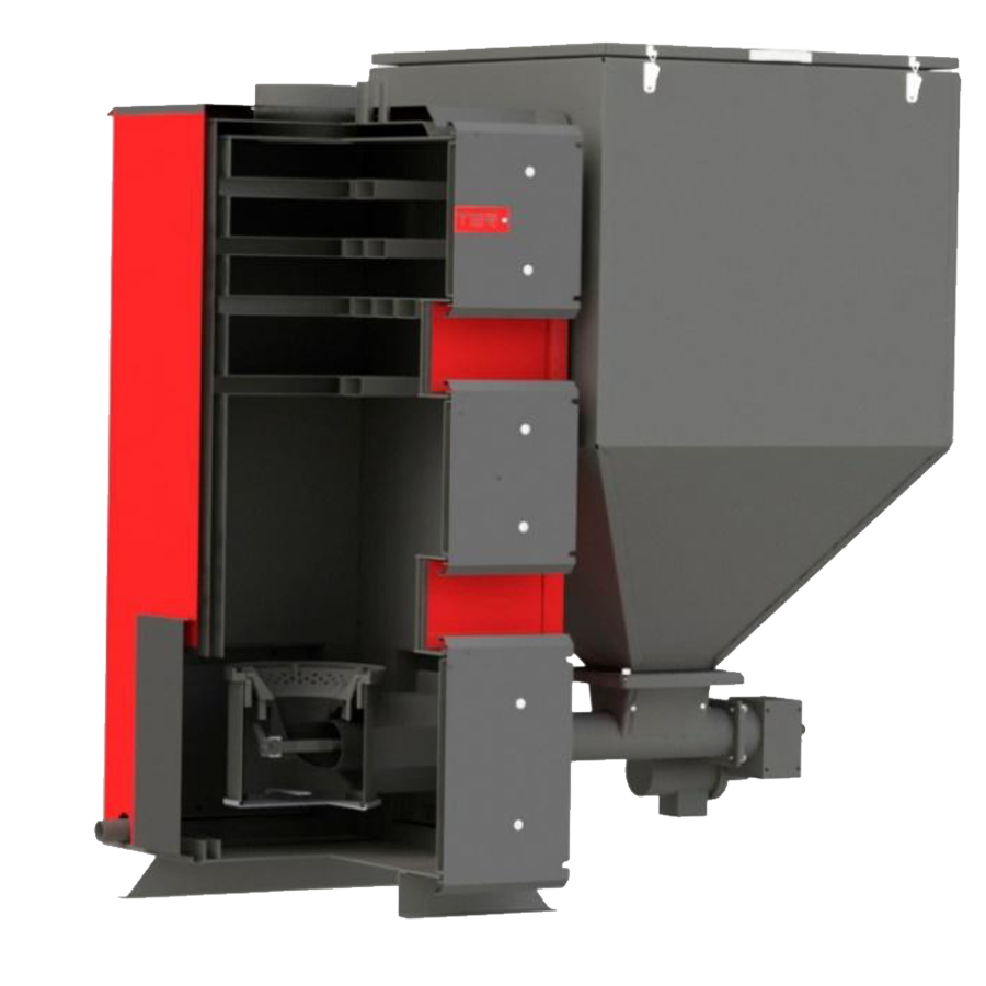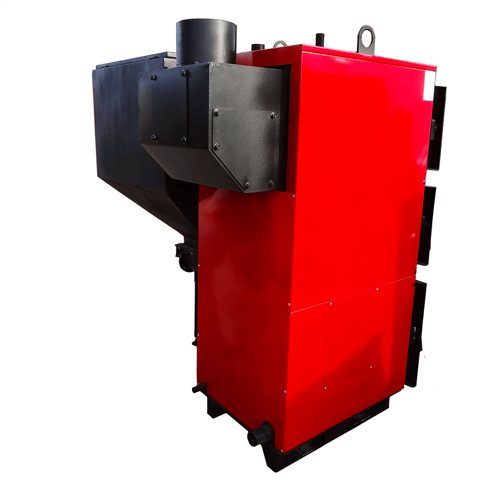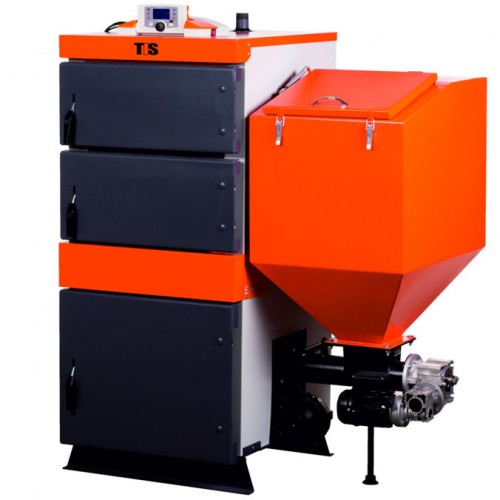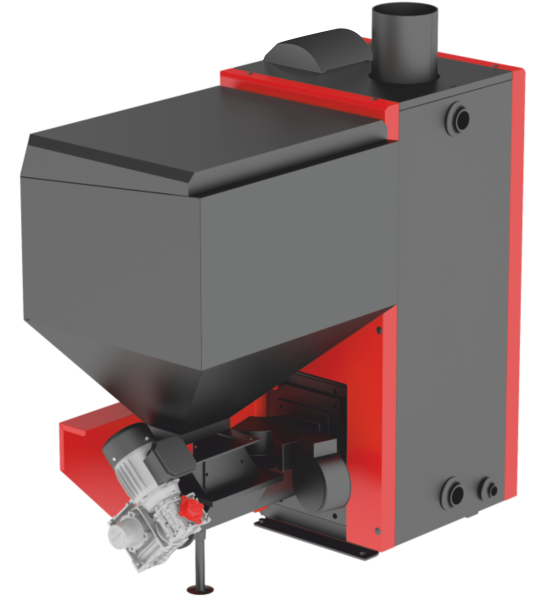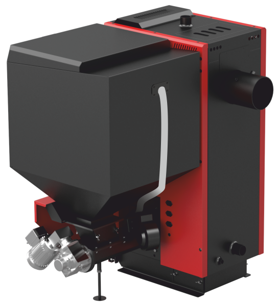 Автоматические котлы комплектуются бункером объемом от 150 до 2000 л (в зависимости от модели котла), шнеком (осуществляет подачу топлива из бункера на горелку), угольной, либо пеллетной горелкой (в зависимости от модели котла), электроникой (контролирует подачей и интенсивностью горения топлива).